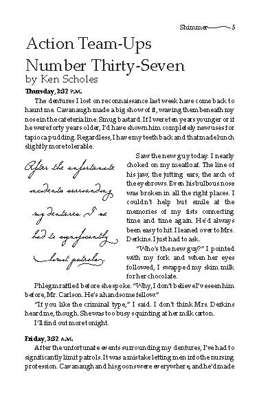 Introducing Shimmer’s first Featured Author, Ken Scholes. Ken’s the author of the first story in our Winter 2006 issue, “Action Team-Ups Number Thirty-Seven,” illustrated by Karl Kessel.